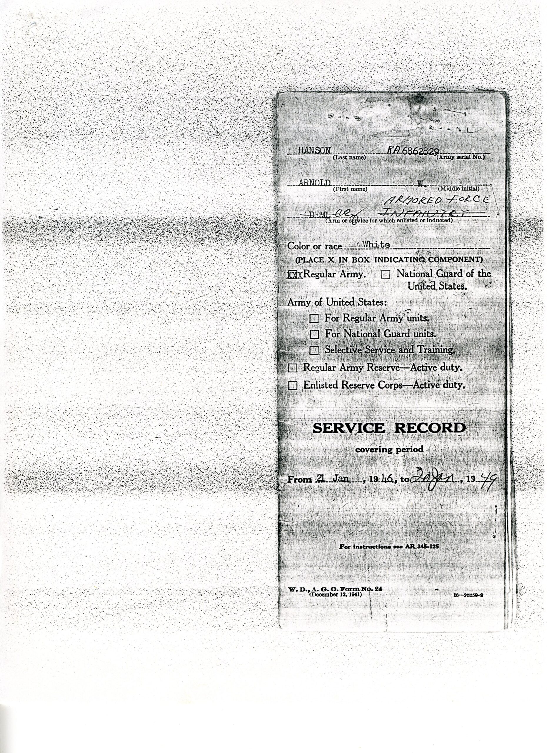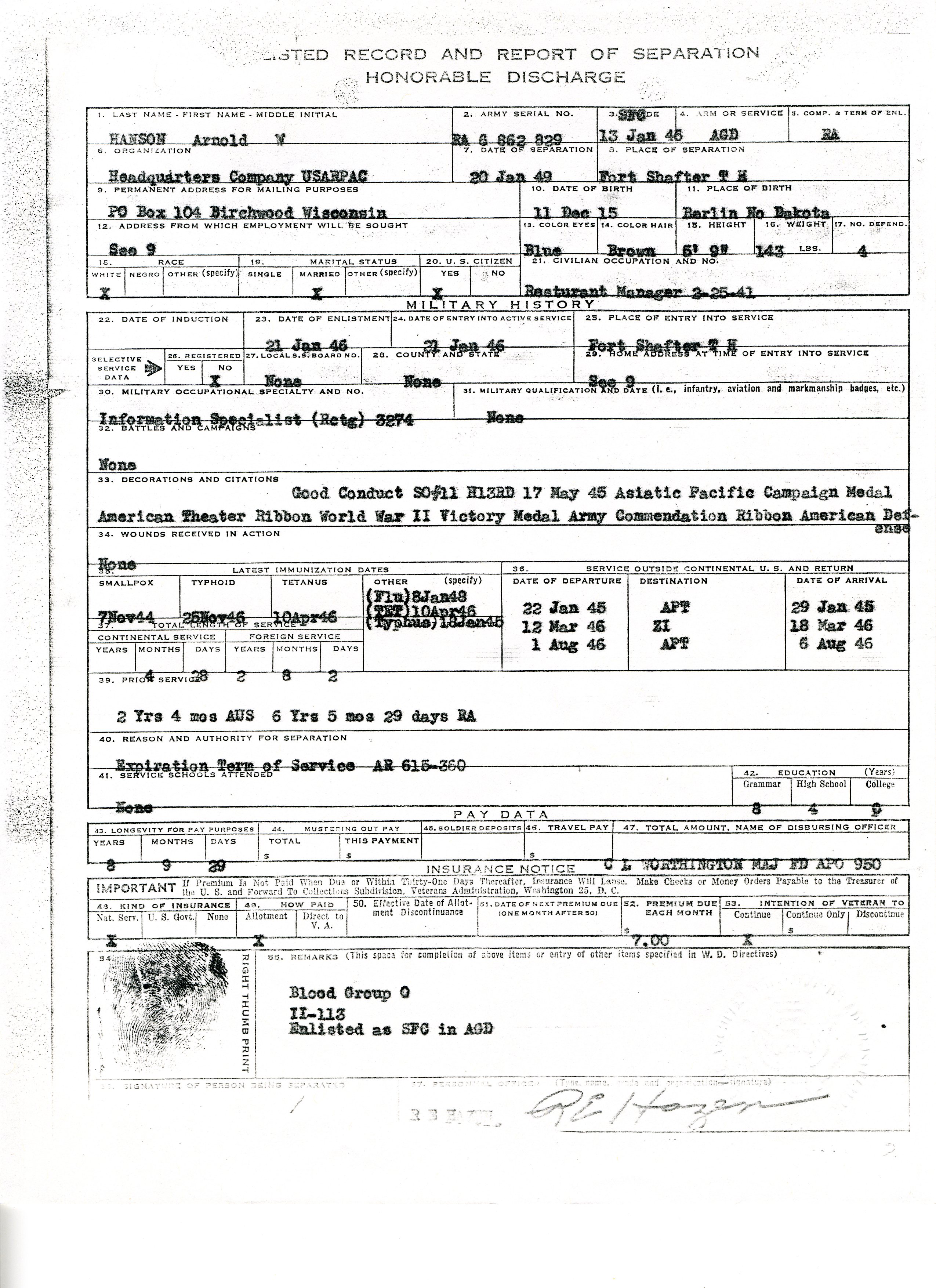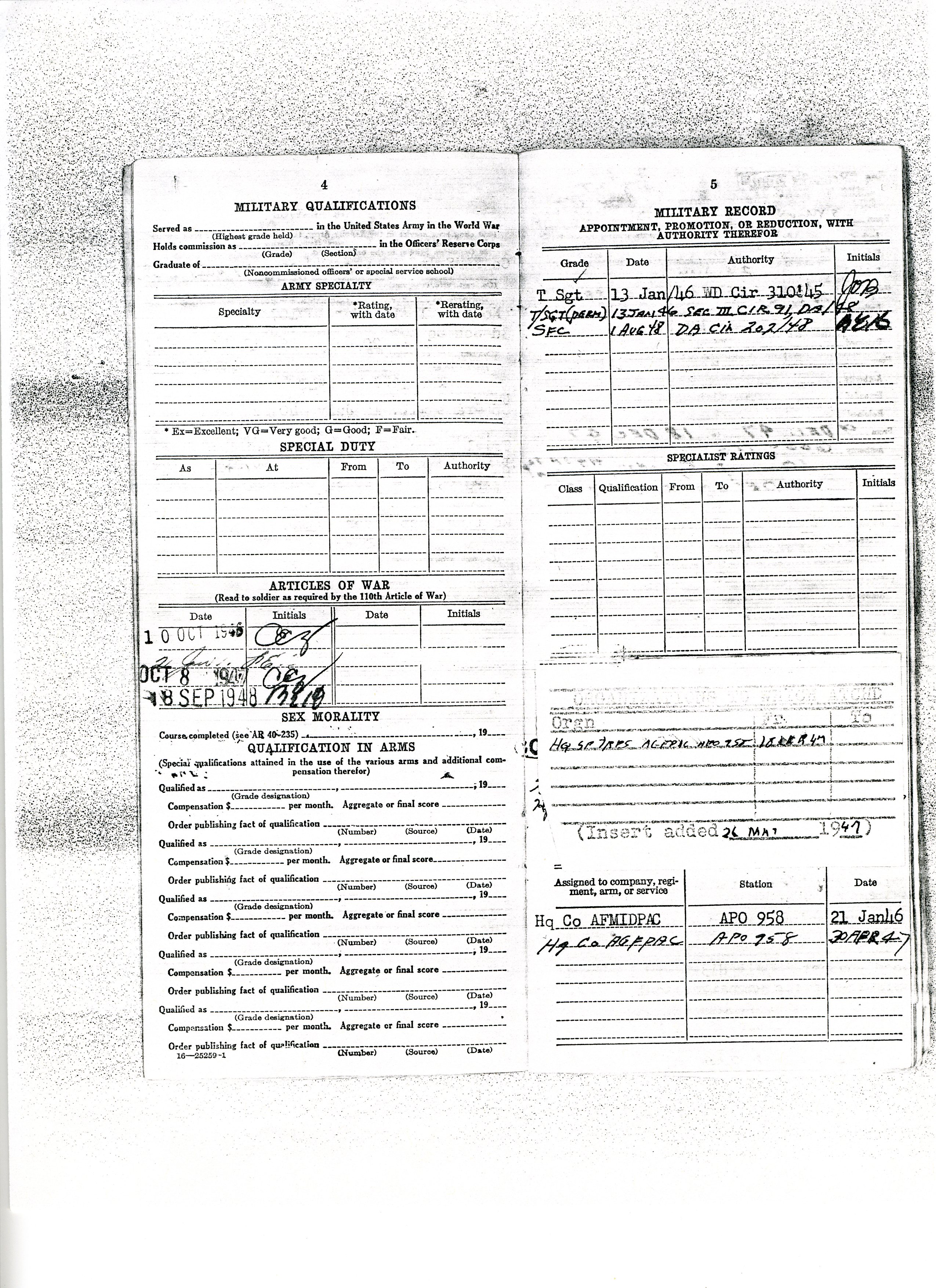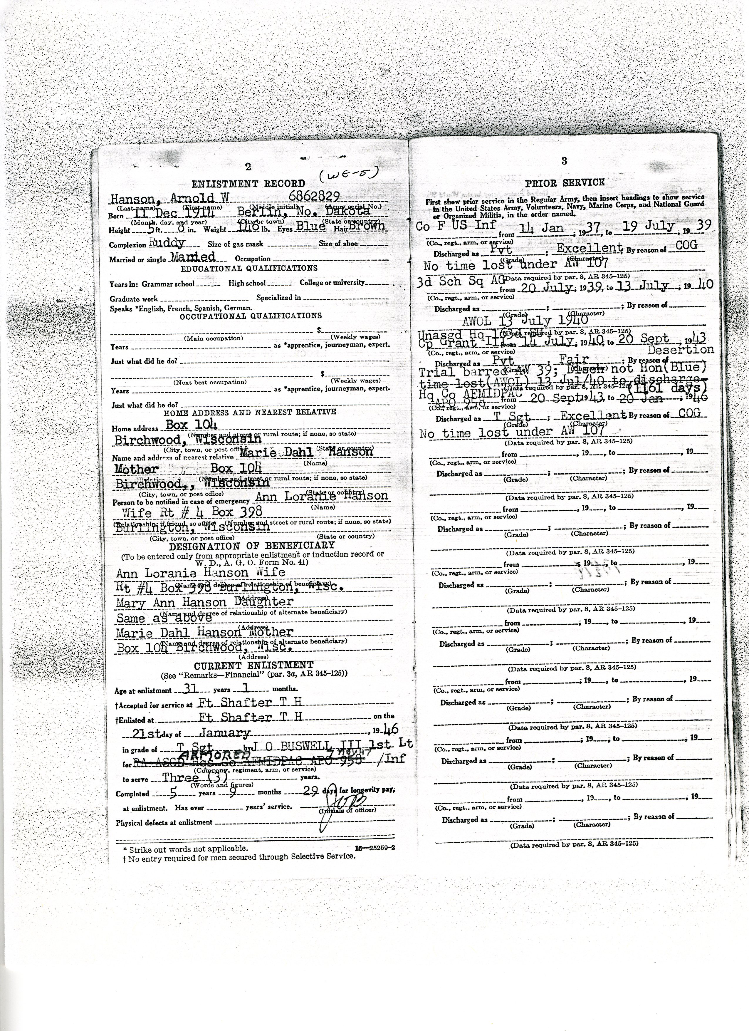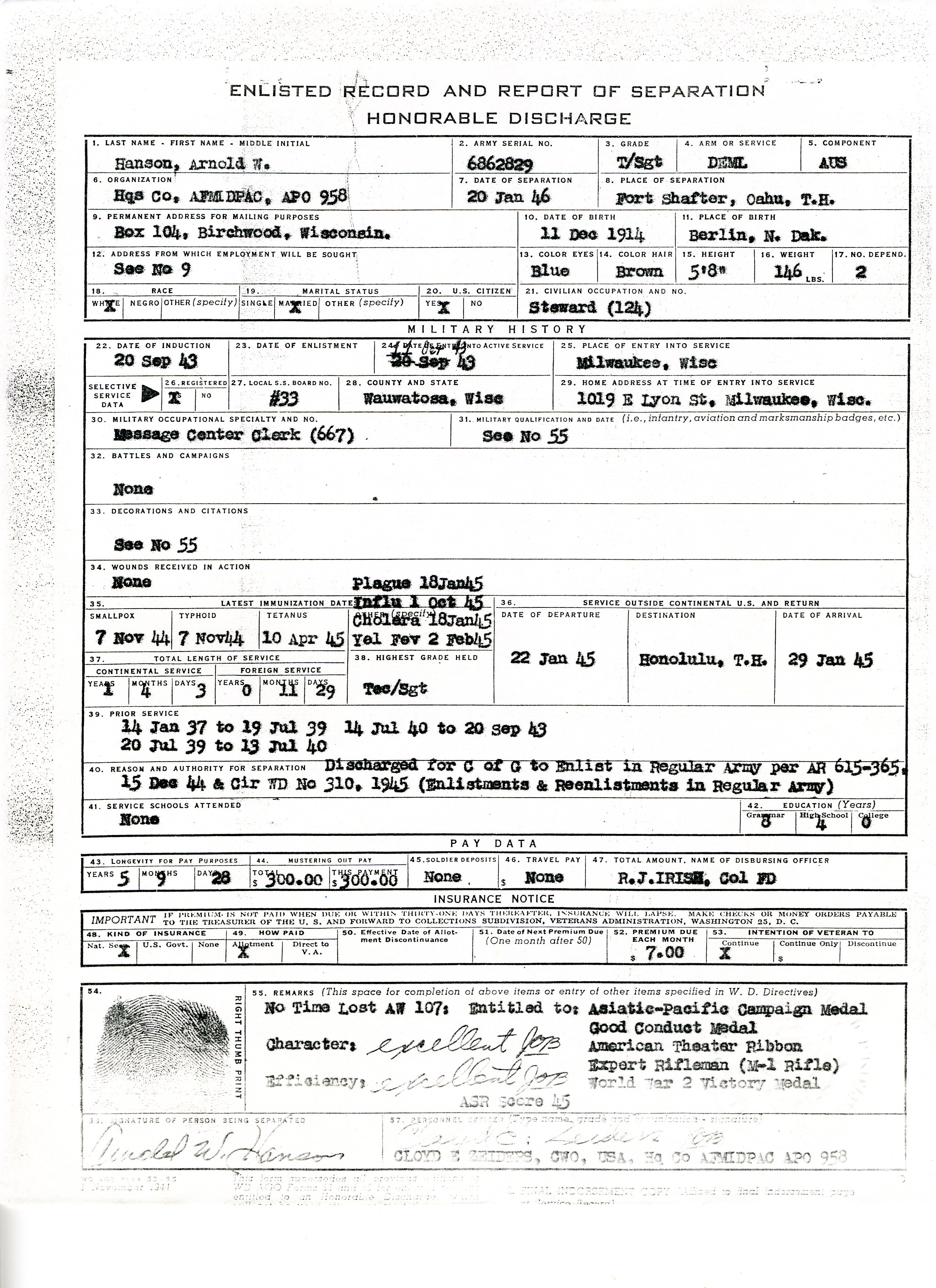20 September 1943 - 20 January 1946: US Army Service Record