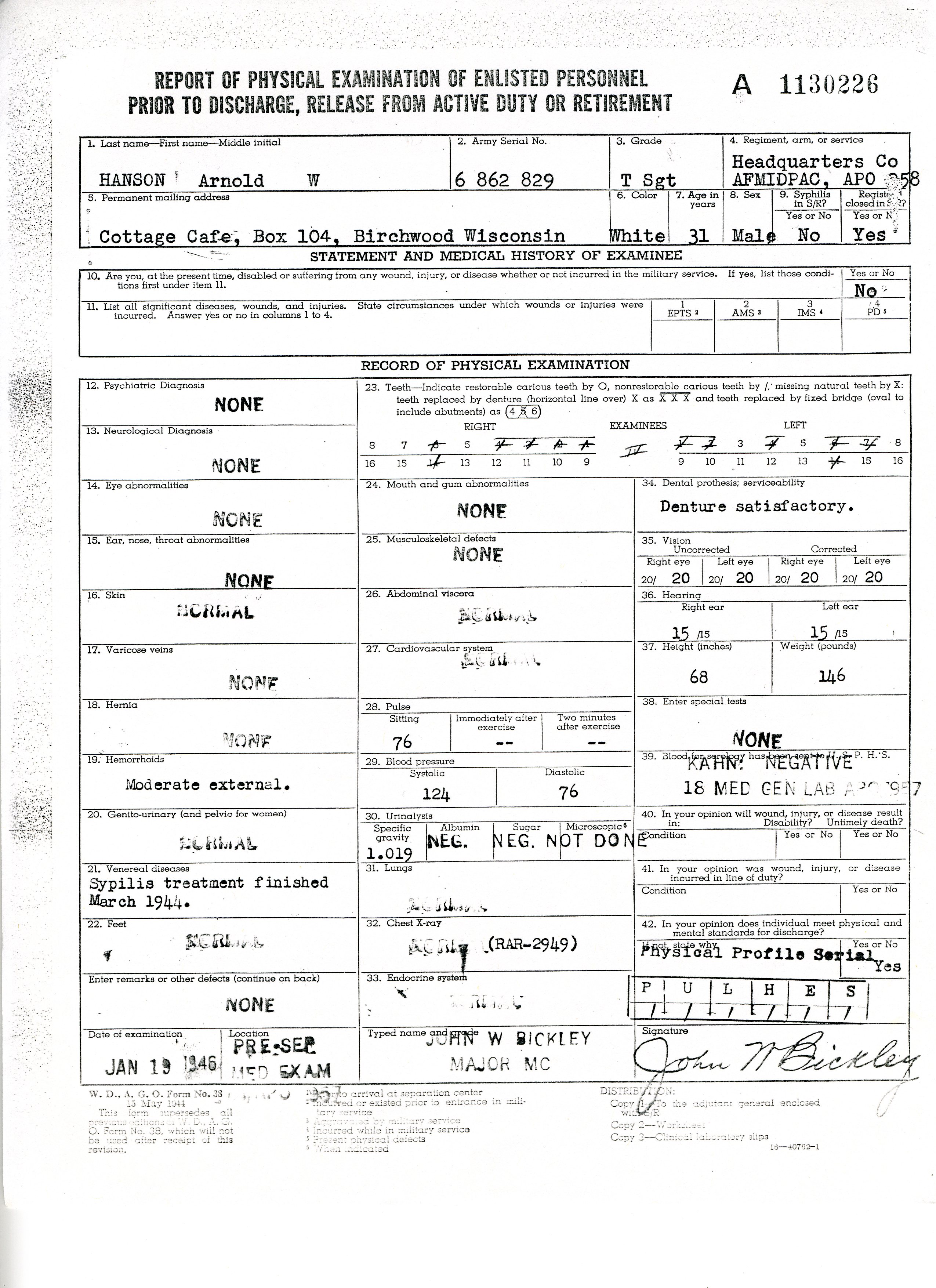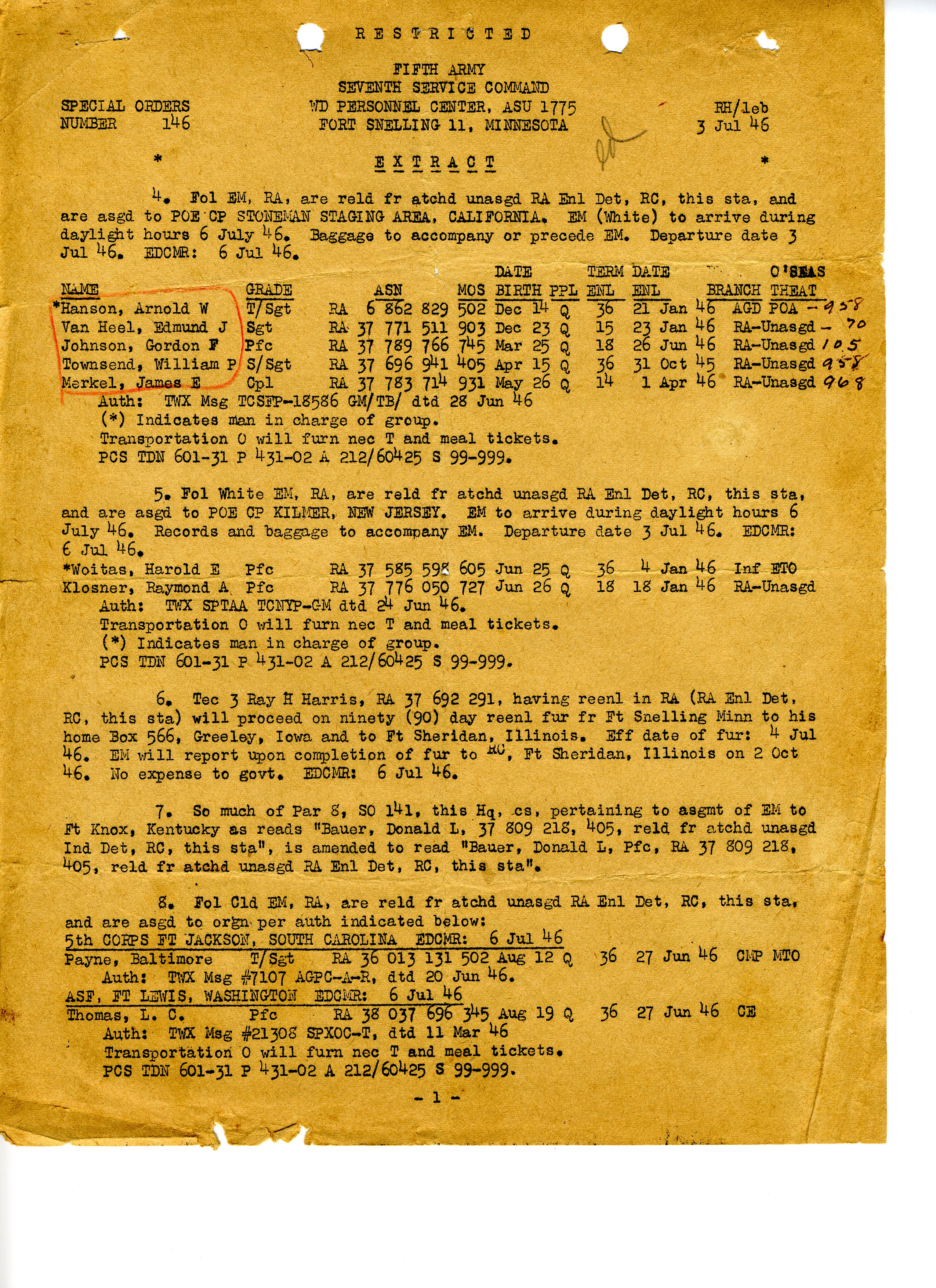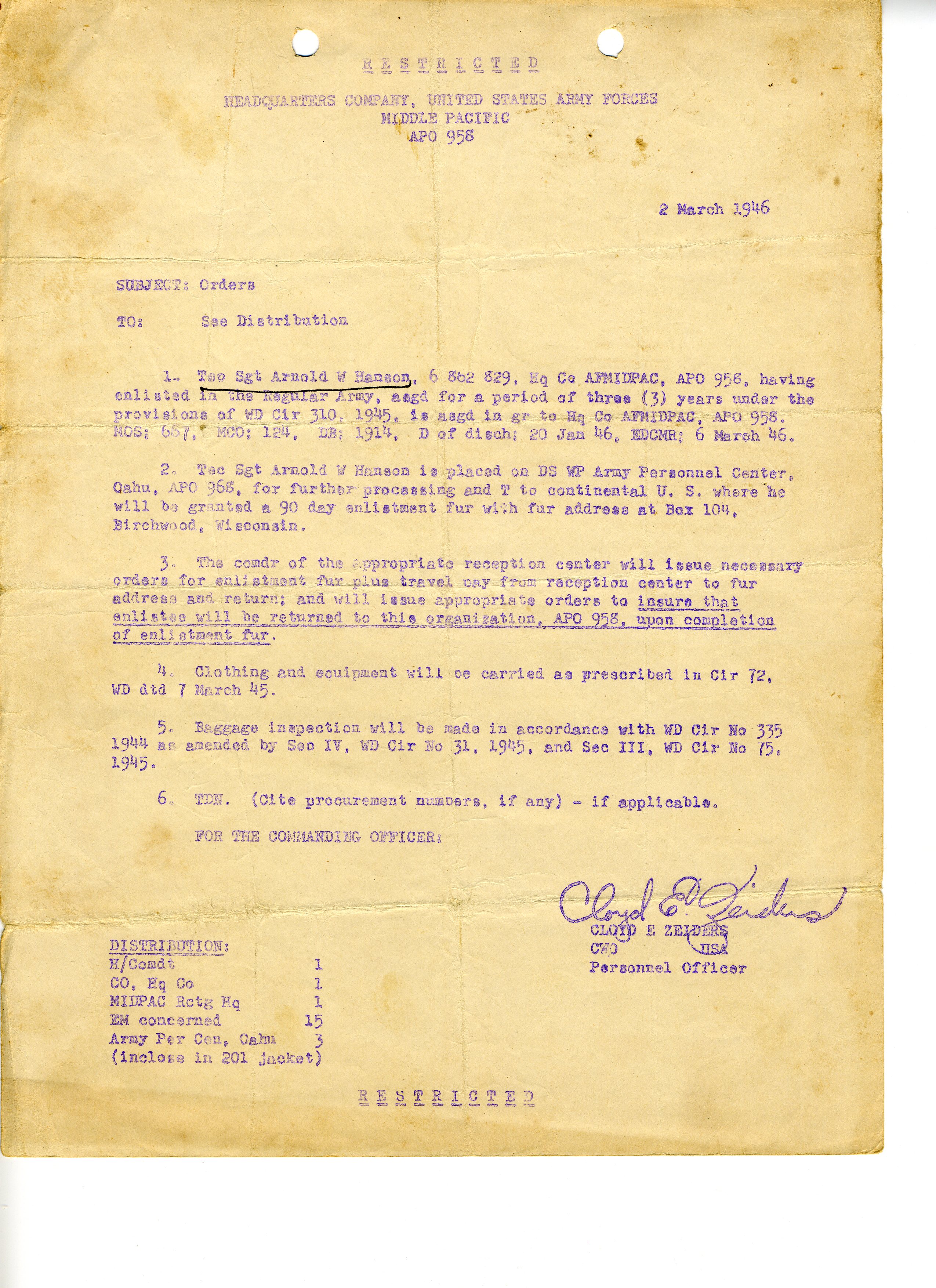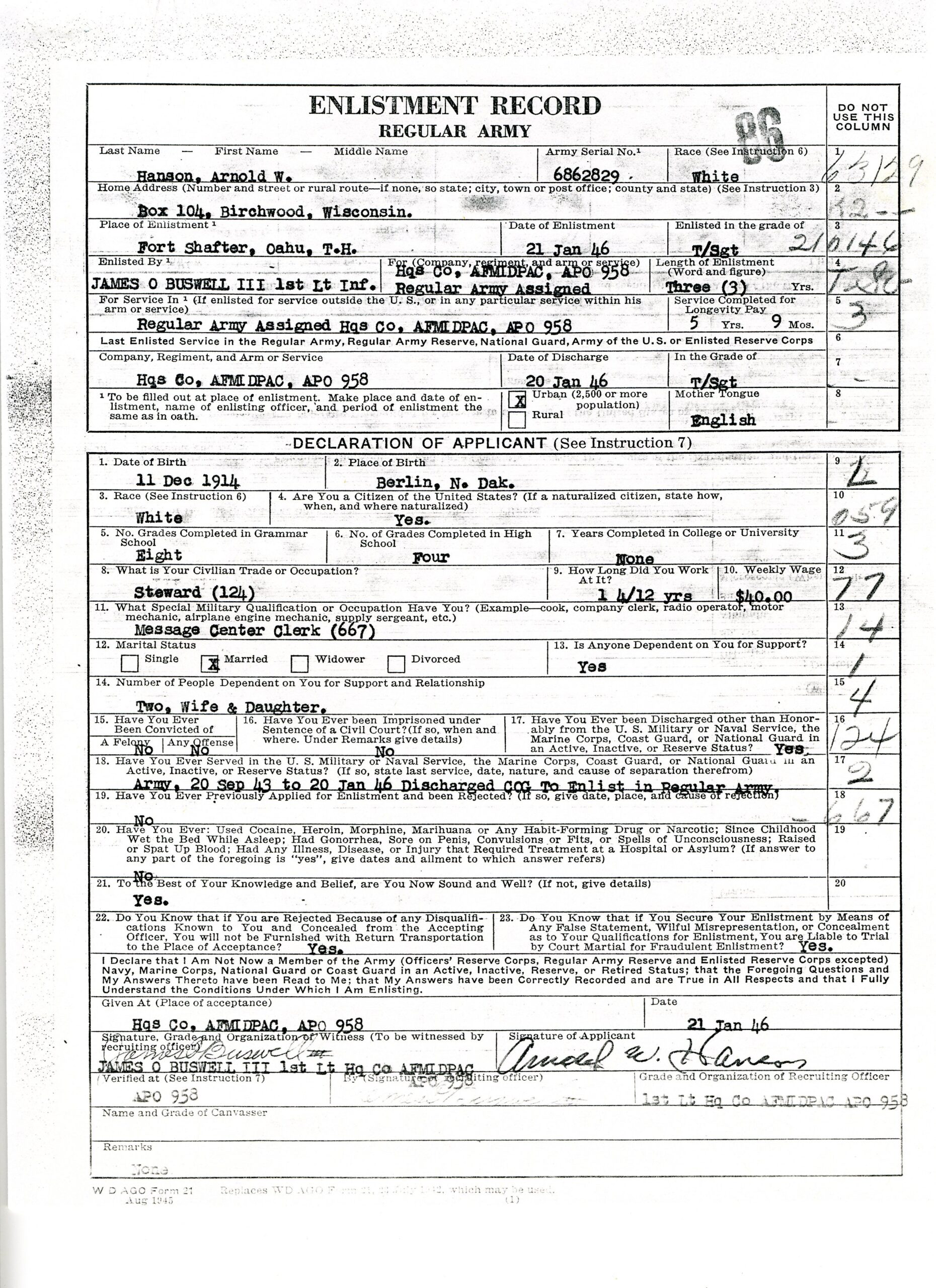 20 September 1943 - 20 January 1946: US Army Service Record